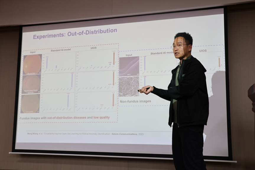 随后,王博士重点介绍了他团队近期的一系列研究进展,包括面向不确定性感知的开放集识别框架,以及在医学图像-文本语料上训练的大规模视觉-语言基础模型。在此基础上,他进一步展示了这些方法如何赋能零样本识别、基于检索的诊断以及更可信的多模态推理。他强调,从高性能模型迈向真正“临床可用”的人工智能系统,必须兼顾模型的可靠性、知识驱动能力与临床场景的复杂需求。