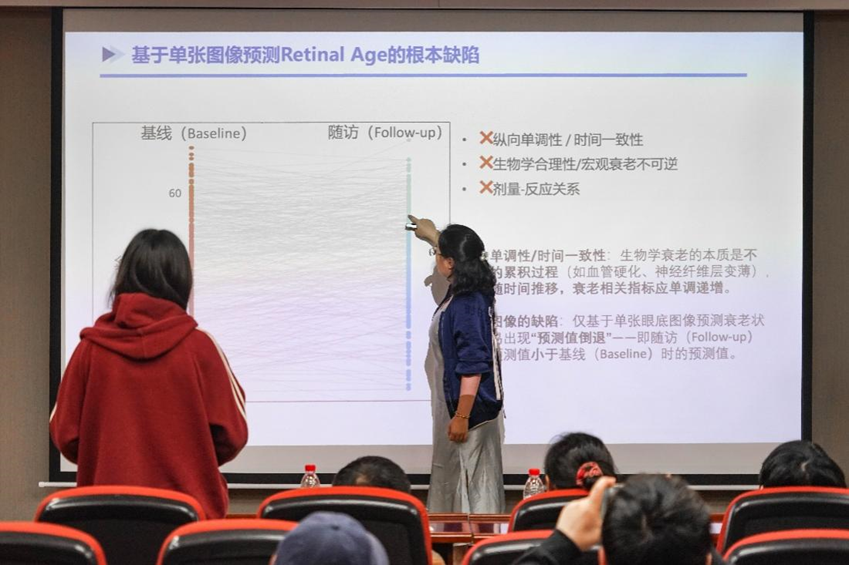 报告伊始,冯洋琴博士指出,视网膜是人体唯一可以通过无创成像直接观察的中枢神经-微血管组织,其影像特征能够反映机体的衰老状态以及多种系统性疾病风险。随着深度学习技术的发展,人工智能为从视网膜影像中挖掘潜在生物标志物提供了新的可能。随后,冯博士重点介绍了两项研究工作:一是构建基于深度学习的多疾病检测框架,实现对多种眼科及系统性疾病的联合预测;二是利用纵向随访数据建立衰老速度预测模型,通过分析视网膜影像的时序变化评估个体衰老进程。她强调,相关研究为利用视网膜影像进行疾病筛查与衰老评估提供了新的方法与思路,有望推动眼科智能医疗的临床转化。整场报告内容丰富、视角新颖,既展示了深度学习与眼科医学交叉的前沿成果,又为疾病早期筛查和个体化健康管理指明了新方向。